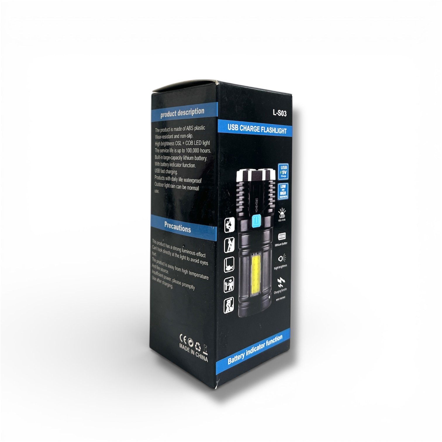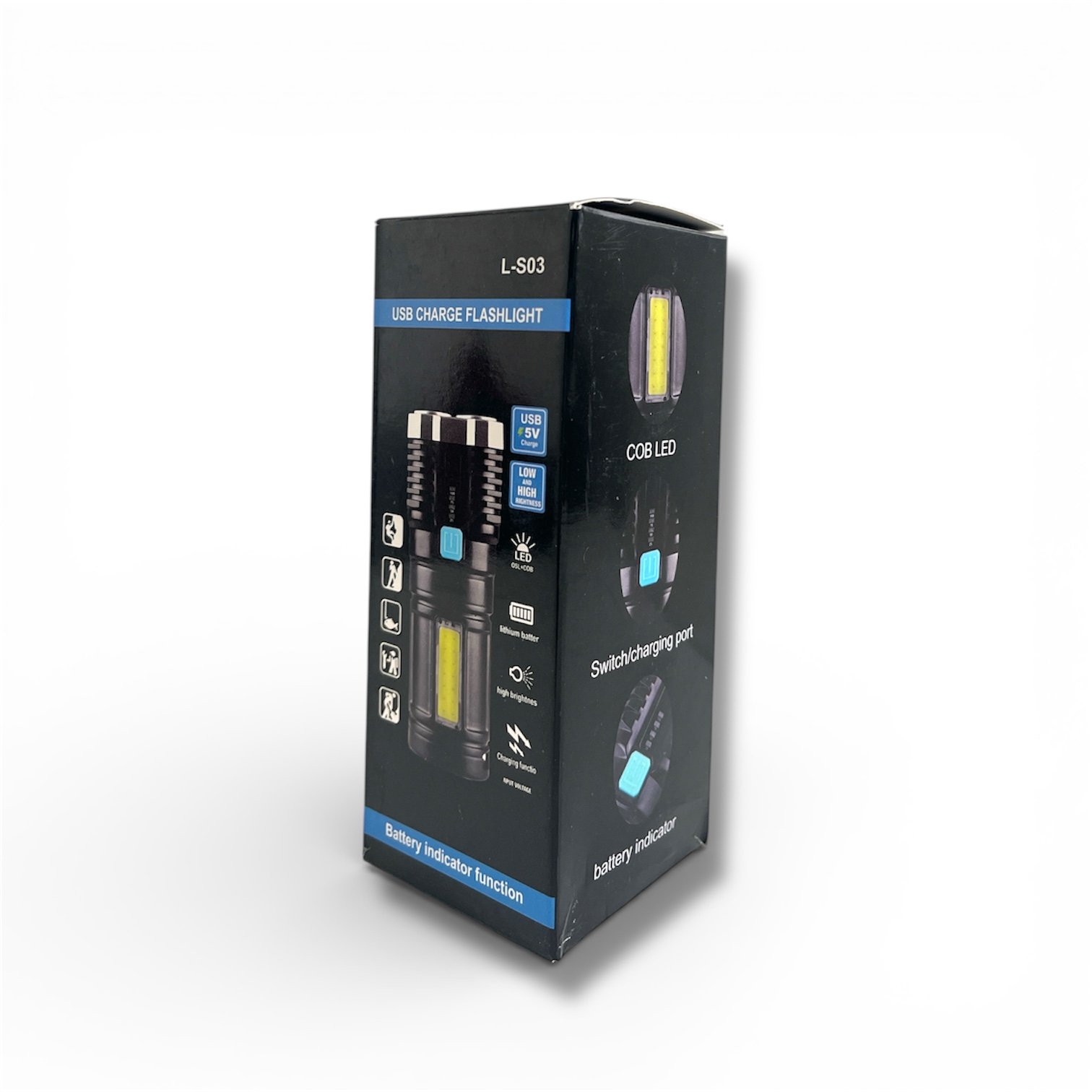 Soyez prêt pour toutes les situations avec la lampe de poche L-S03, un outil d’éclairage haute performance indispensable. Fabriquée en plastique ABS robuste, cette lampe est à la fois légère, antidérapante et résistante à l’usure quotidienne. Elle combine une source lumineuse principale OSL de haute luminosité pour la longue portée avec un panneau LED COB latéral pour un éclairage de proximité large et diffus. Idéale pour le camping, la randonnée ou les pannes de courant, elle se recharge facilement via USB et dispose d’un indicateur de batterie intelligent pour ne jamais être pris au dépourvu.
